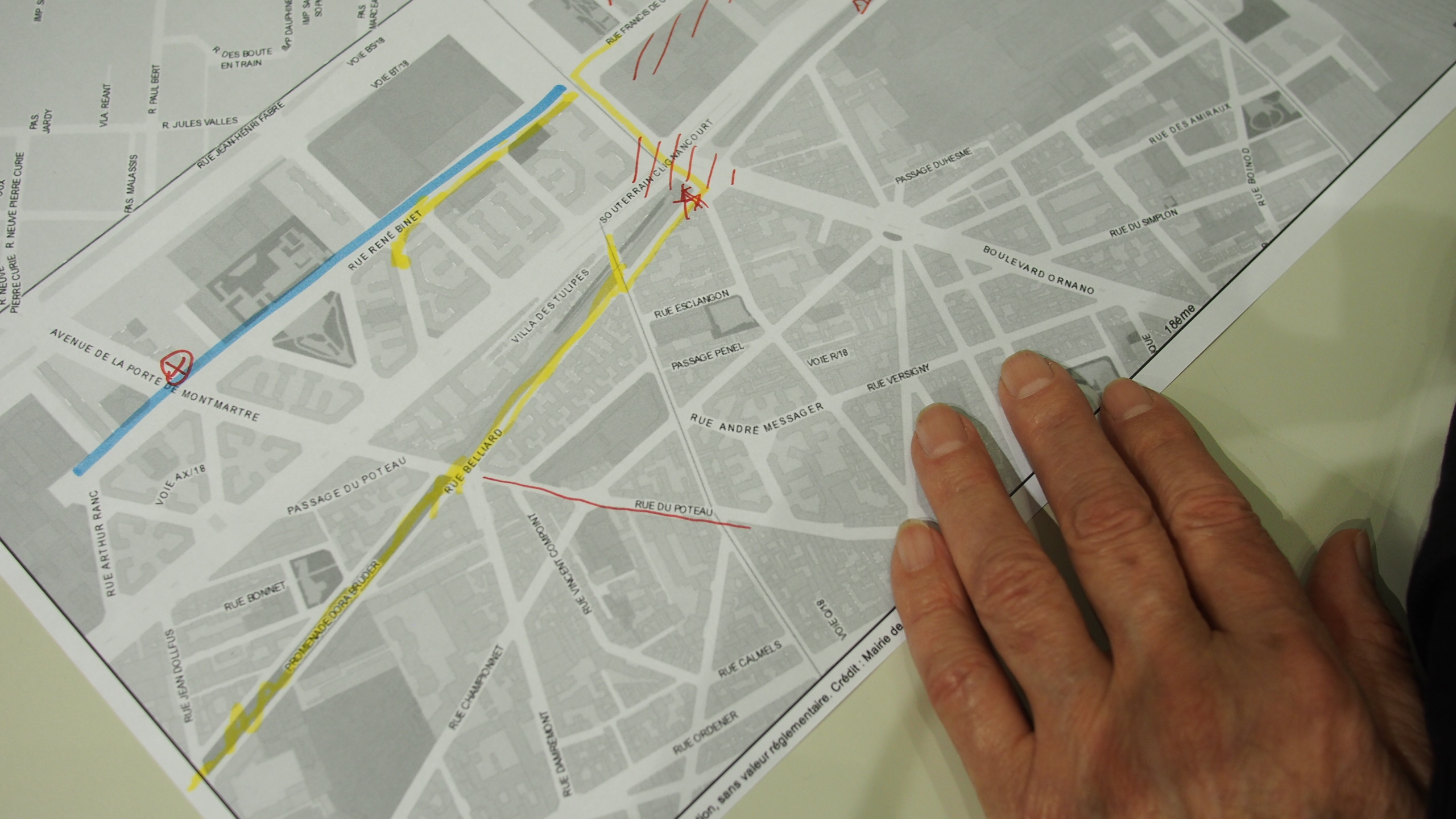 Paris, Porte de Clignancourt. Je m’interroge sur l’identité des lieux, sur ses limites, où elle commence, où elle s’arrête. « Cartes sur table » est une rencontre avec Isis, Kamafi, Moussa et Xavier. Ils habitent là ou ils y passent simplement. Chacun raconte la Porte à sa manière, la reconstruit. Les mains tracent des lignes sur une feuille blanche, les voix commentent et des fragments de parcours de vie se dessinent.